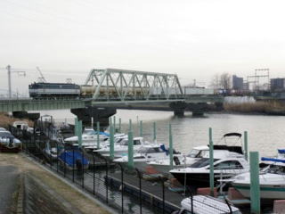 【新中川橋梁】左の写真は南側から撮影したもので列車は新小岩へ向かって います。右の写真は反対側からでボートの係留場が手前にあります
